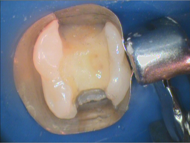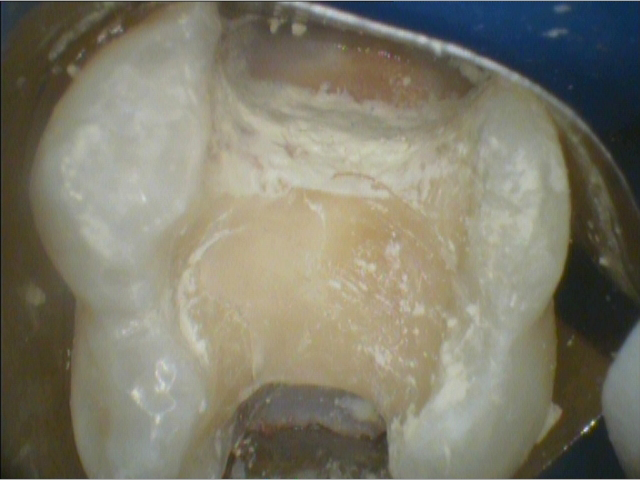 The patient was anesthetized with an inferior alveolar block with 4% Septocaine(1:100,000epi). Isolation was obtained with a rubber dam. The remaining amalgam restoration was removed with a high-speed carbide bur. The deep distal caries were excavated completely with a #6 round carbide bur with low torque. A very thin layer of dentin was left remaining over the pulp (Fig. 2). A traditional matrix band was placed. Biodentine was prepared, triturated and placed in a layer over the thin dentin (Fig. 3). The Biodentine was allowed to set for its 12-minute set time.The preparation was then refined and cleaned.