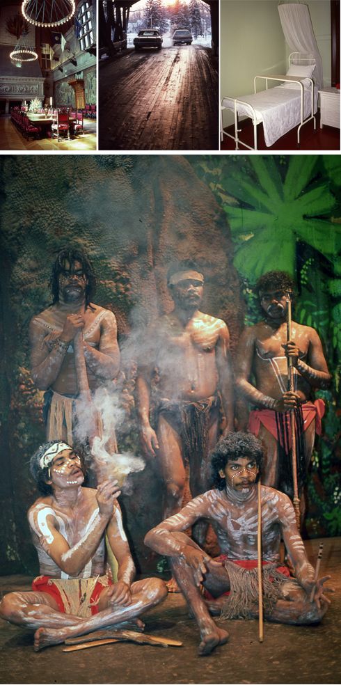 San Simeon, California. Covered Bridge, New England. Original hospital bed, Alice Springs, Australia. World famous Pamagirri Aboriginal Dancers, Kuranda Station, Near Cairns, Australia