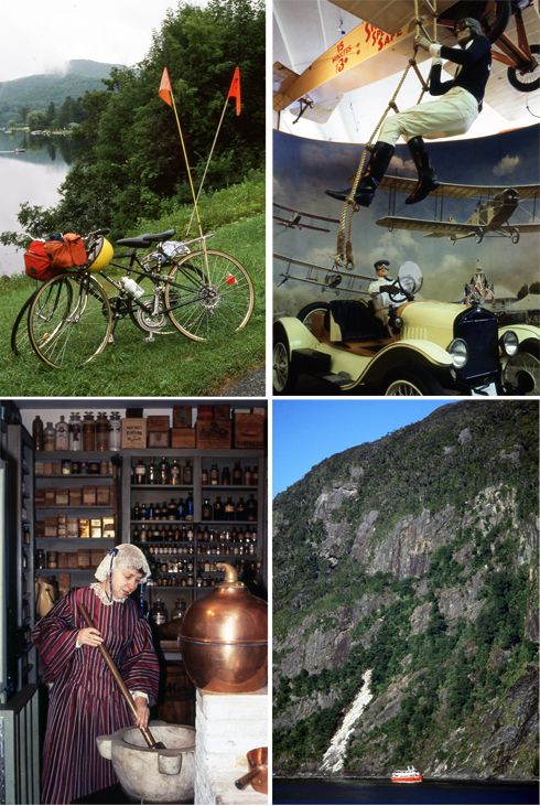 Bicycling in Vermont. Barnstormers at the Aeronautical Museum, San Diego. Polly Mitchell, a “19th Century apothecary” at the Shelburne Museum in Vermont. South Island, New Zealand