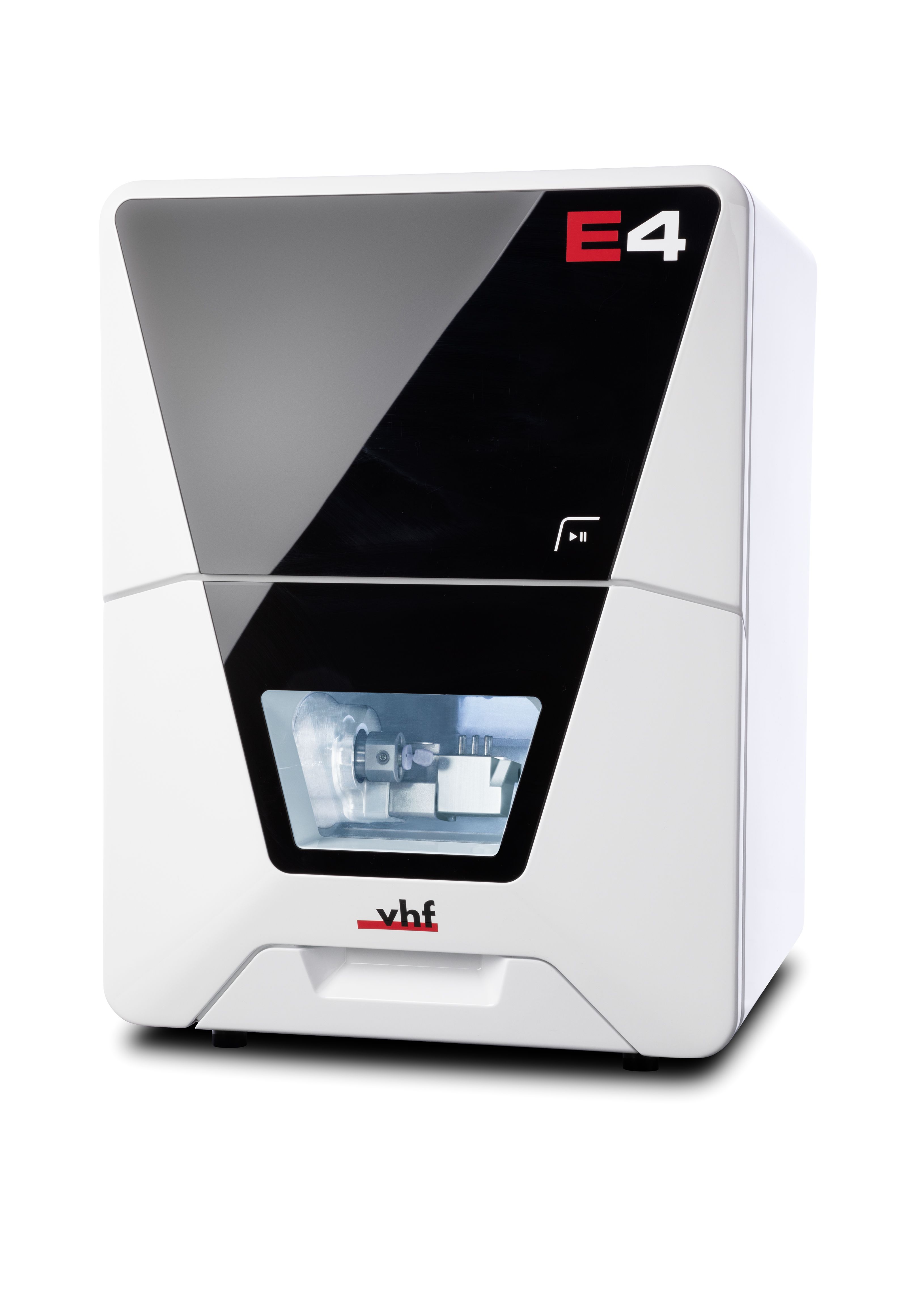 The E4 is free from compressed air, features a low weight of 28 kg, and its compact housing requires only slightly more floor space than an A3 sheet of paper, according to a press release from vhf. The machine is operated via the provided DENTALCAM software without any additional licensing costs.