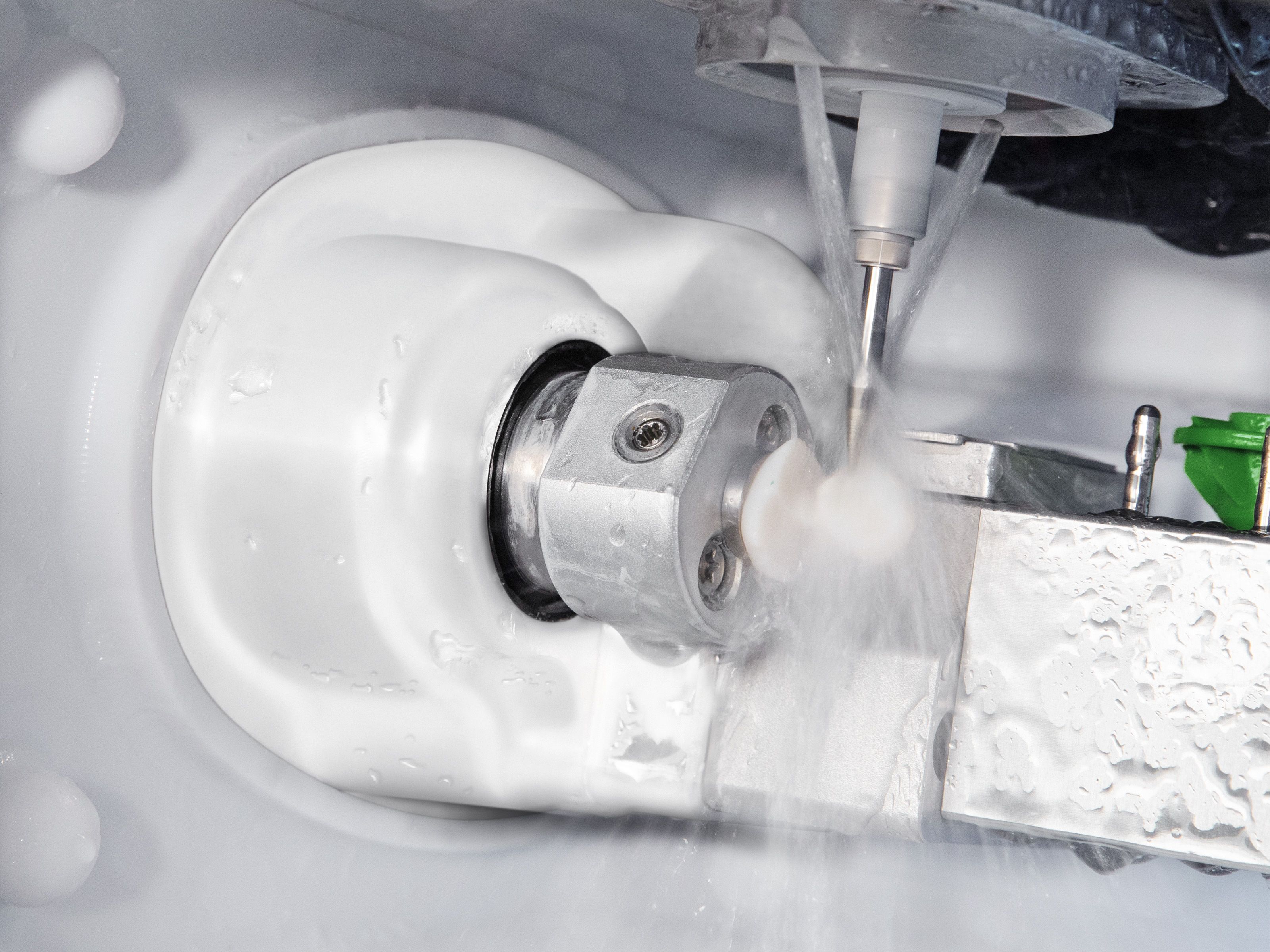 The E4 also operates completely without compressed air, meaning it does not require an external connection for compressed air or a built-in compressor. This feature reportedly helps save further costs and allows more flexibility in the placement of the machine. This freedom from compressed air is made possible by vhf’s patent-pending AIRTOOL. The turbine blades of this tool generate a strong airflow due to the high speeds of the high-frequency spindle, which keeps the workplace free of chips and dust.