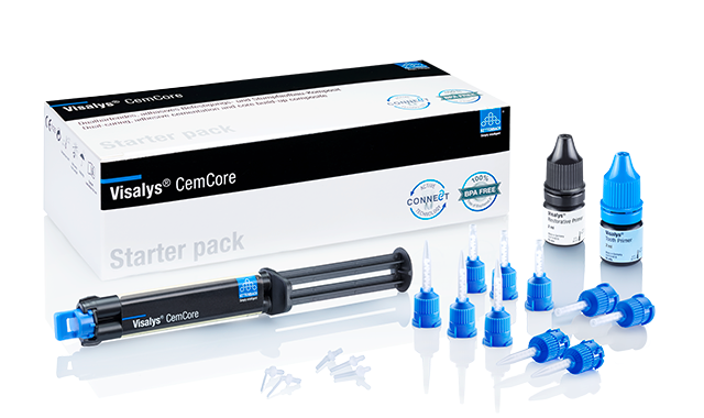 This makes the Visalys CemCore system suitable both for cementation and also for core build-up using a single composite–the Active-Connect-Technology ensures powerful adhesion with Visalys Tooth Primer and Visalys Restorative Primer, while low liquid absorption ensures a high degree of dimensional stability in the core build-up and hence a reduced risk of fracture in the final restoration. Visalys CemCore is available to try in Universal (A2/A3) color with a starter pack, which includes not only the Visalys CemCore but also Visalys® Tooth Primer and Visalys® Restorative Primer, along with the required accessories.