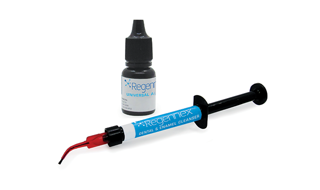 Regennex is proprietary chemistry, and its active ingredient is bioglass, an osteogenic catalyst that’s said to stimulate bone cells towards self-repair. Bioglass is a biocompatible, antimicrobial material that has been verified to release ions that stimulate hydroxyapatite formation. The clinical benefits include the closure of gaps at the resin-dentin interface and improved bond longevity.