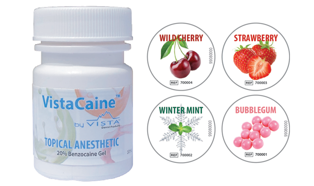 VistaCaine is a 20 percent benzocaine gel and is offered in individual 1 oz. bottles or a variety pack of eight 1 oz. bottles. The gel is available in four flavors: winter mint, strawberry, wild cherry and bubble gum.
