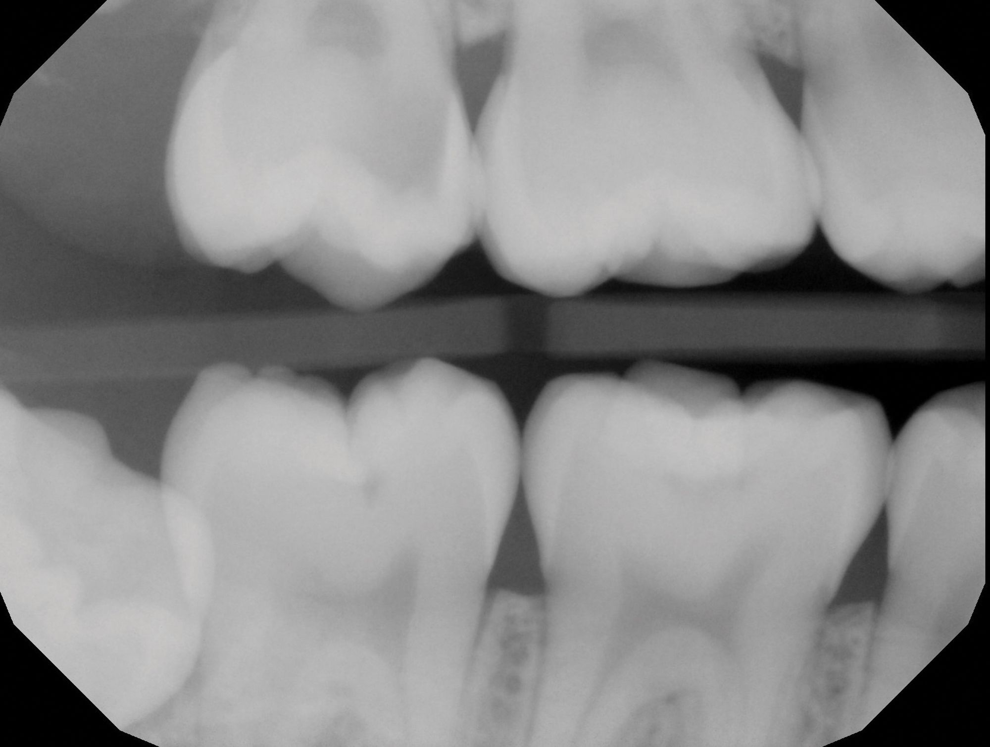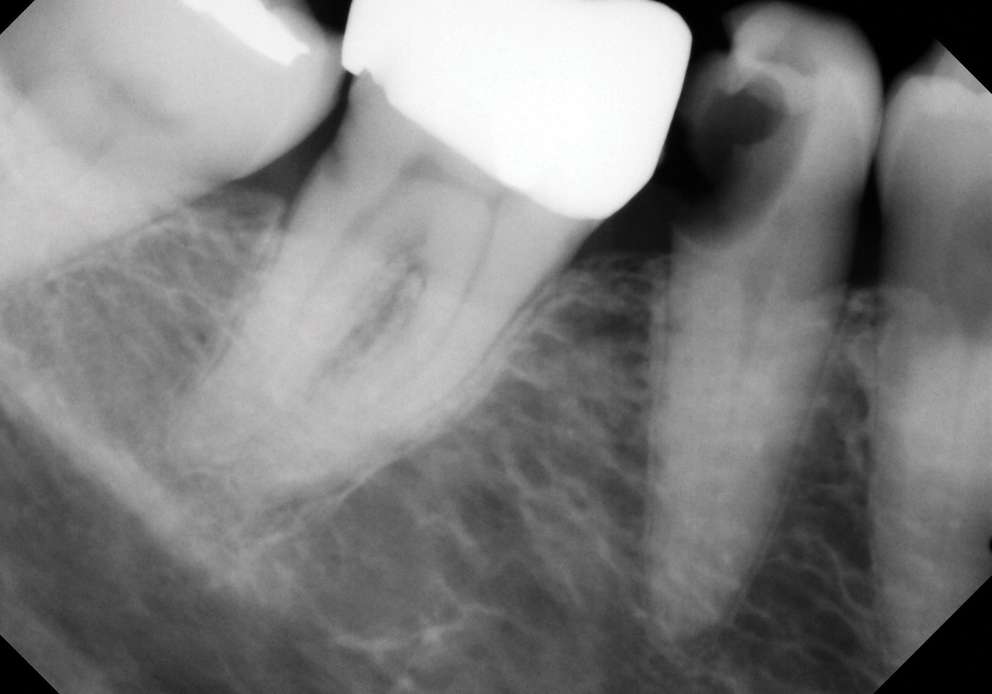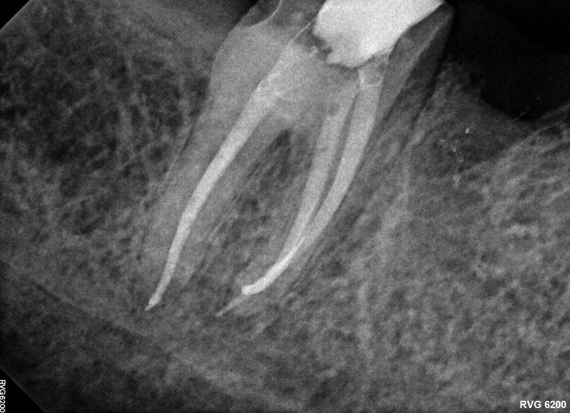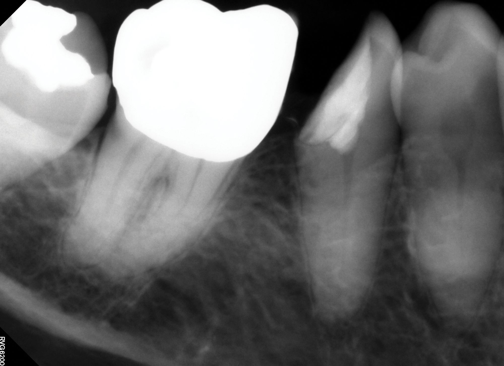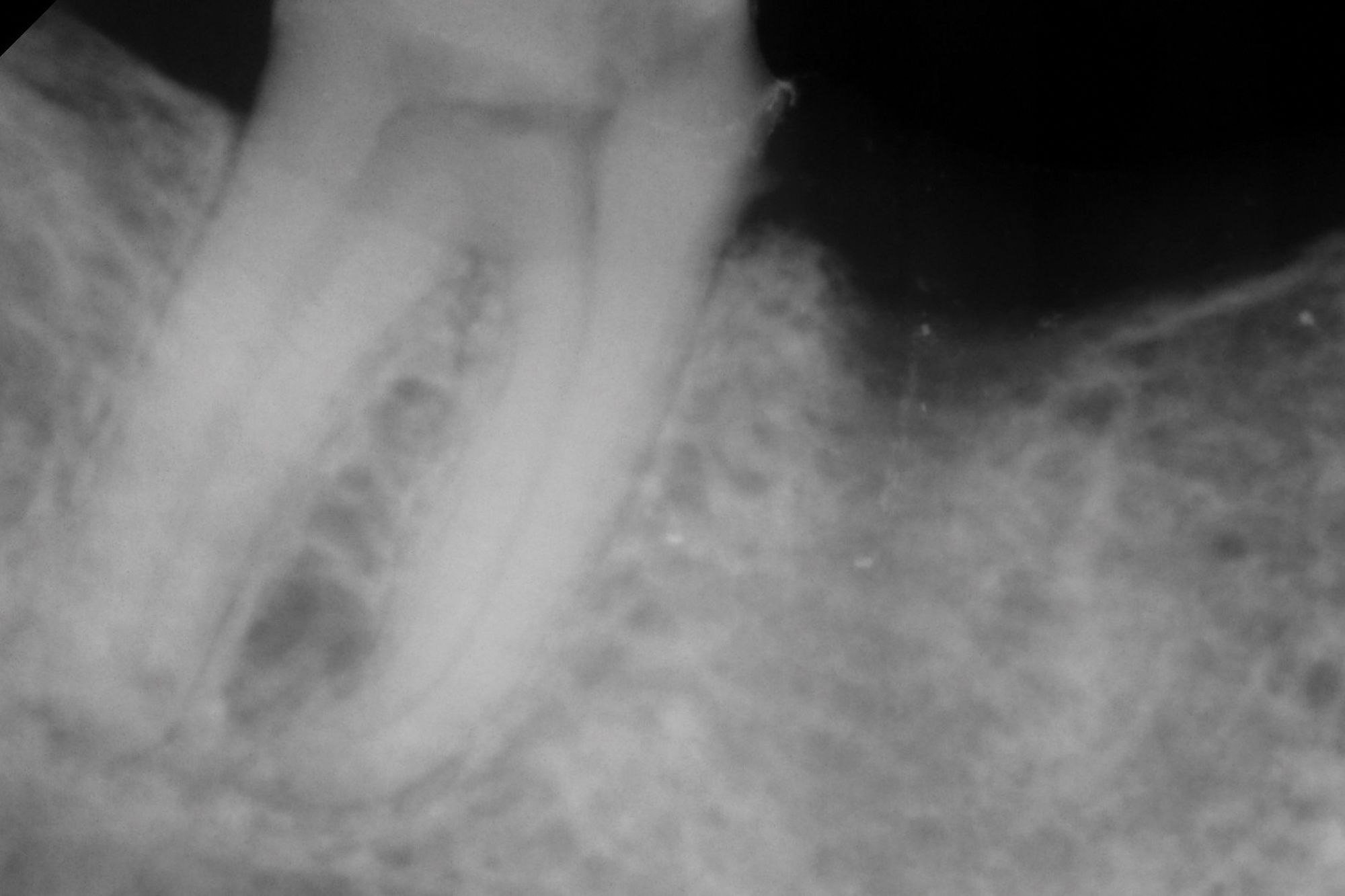 Figure 3B. Although vital pulp therapy was planned for tooth No. 31 during the consultation visit—at which the patient had no symptoms or abnormalities on clinical testing (A) —discomfort and cold sensitivity on the day of treatment were consistent with hyperemic pulp tissue extending into the roots. The diagnosis of symptomatic irreversible pulpitis instead warranted nonsurgical root canal therapy to manage (B)