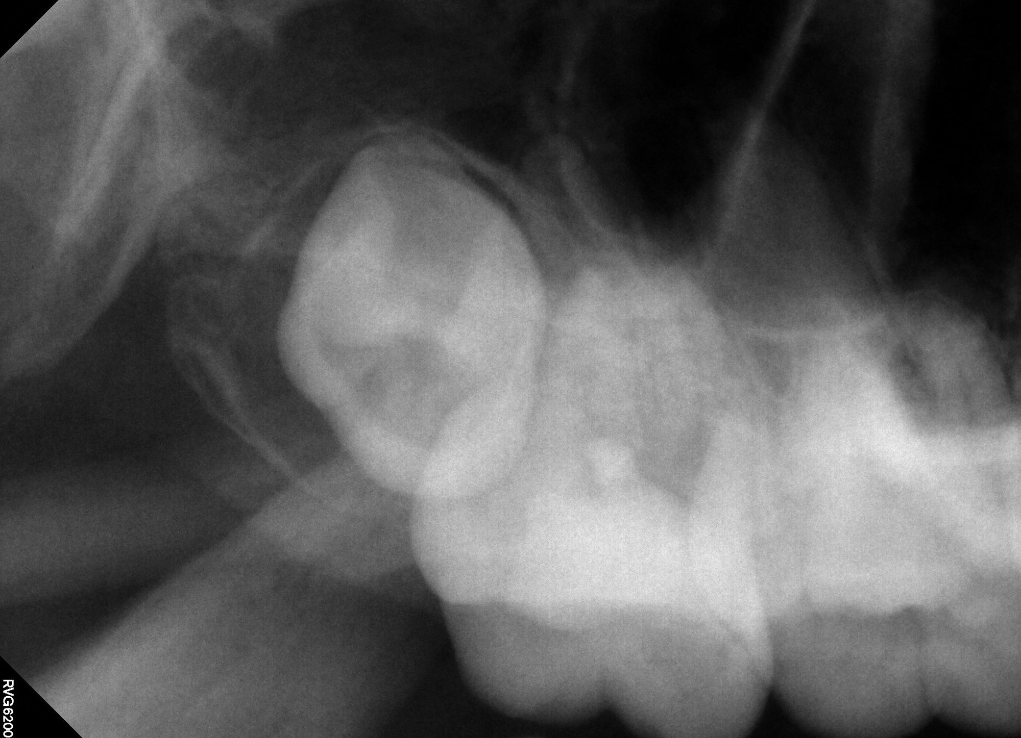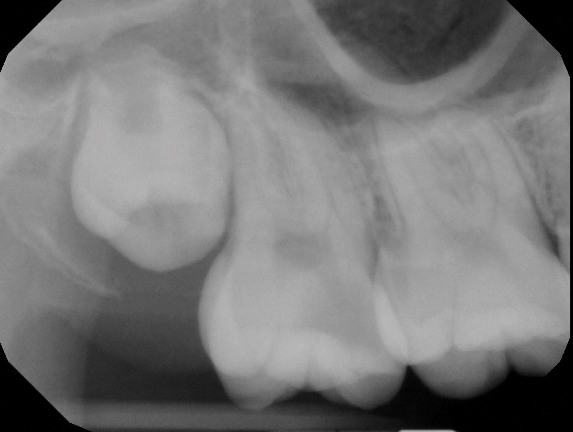 Figure 1C. Preoperative images (A and B) depicting deep caries in tooth No. 2 without associated symptoms or clinical testing abnormalities allowed for conservative direct pulp capping to manage the carious exposure (C).