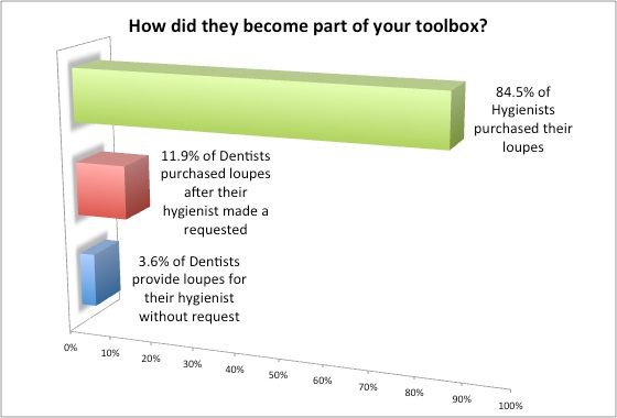 Almost 85% of the surveyed hygienists said that they purchased their own loupe and only 12% of dentists purchased them after the hygienists requested them.