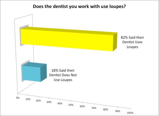From the survey, we found that 83% of hygienists and 82% of the dentists they work with wear loupes, leaving 17% of hygienists and 18% of dentists not wearing loupes.