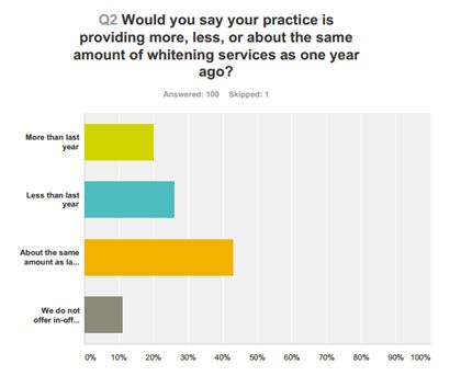 A majority of dental practices said that they are doing about the same amount of whitening as last year. However, more answered they were doing less this year than those who said they were seeing an increase.