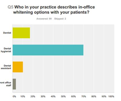 Yes hygienists, when it comes to who has the job to explain whitening and its benefits, it falls to you in most of the practices (to the tune of 69.7 percent of our respondents).