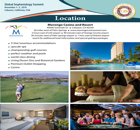 The mission of the Global Implantology Summit is to share knowledge from great speakers around the world to aid in improving the dental treatment we provide. Whether you are an expert wishing to further your knowledge or a dentist interested in surgery or the restorative aspects of treatment, join us at the Morongo Casino and resort spa for three days of incredible education and up to 24 CE Units.