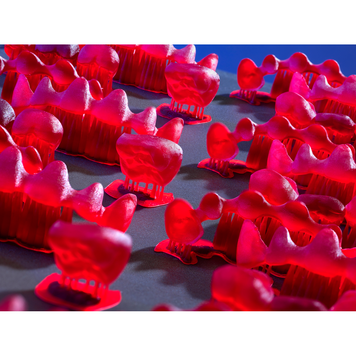 The material's red color is said to make it easier to discern details in printed parts. It is suited for printing crowns, bridges, substructures, and removable partial frameworks, and the resin is durable but burns out cleanly without leaving ash or other residue. The material is designed for both investment casting and ceramic pressing, and pairs optimally with Whip Mix ResinVest.
