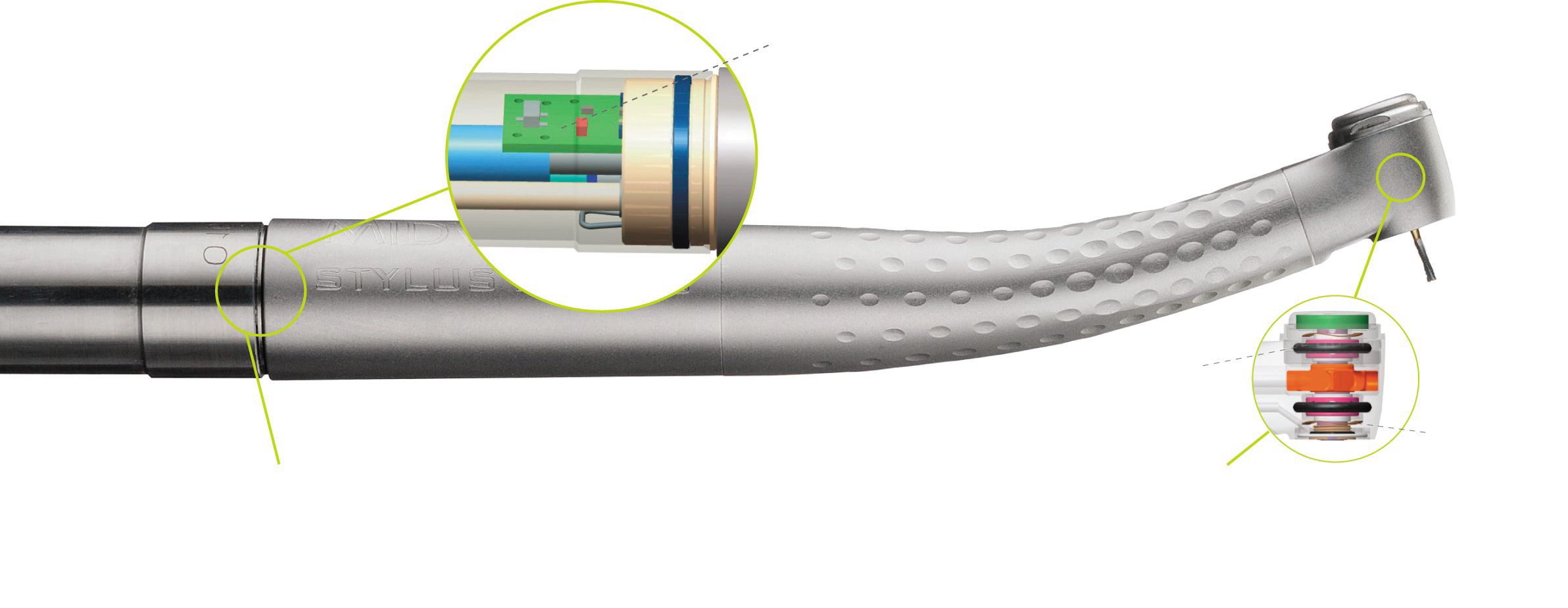I was very impressed with the brightness of the light, its smooth running, low noise and high torque performance. But mostly, I liked the ease of just connecting the system without any fiber-optics. Of the 4-hole fixed back end and the quick connector KaVo®-style model, I prefer the quick connector. It fits directly with my existing system and I like the ease of connection and the freeness of tubing rotation. It also has an anti-retraction head and a water flow ring that lets you control the level of spray.