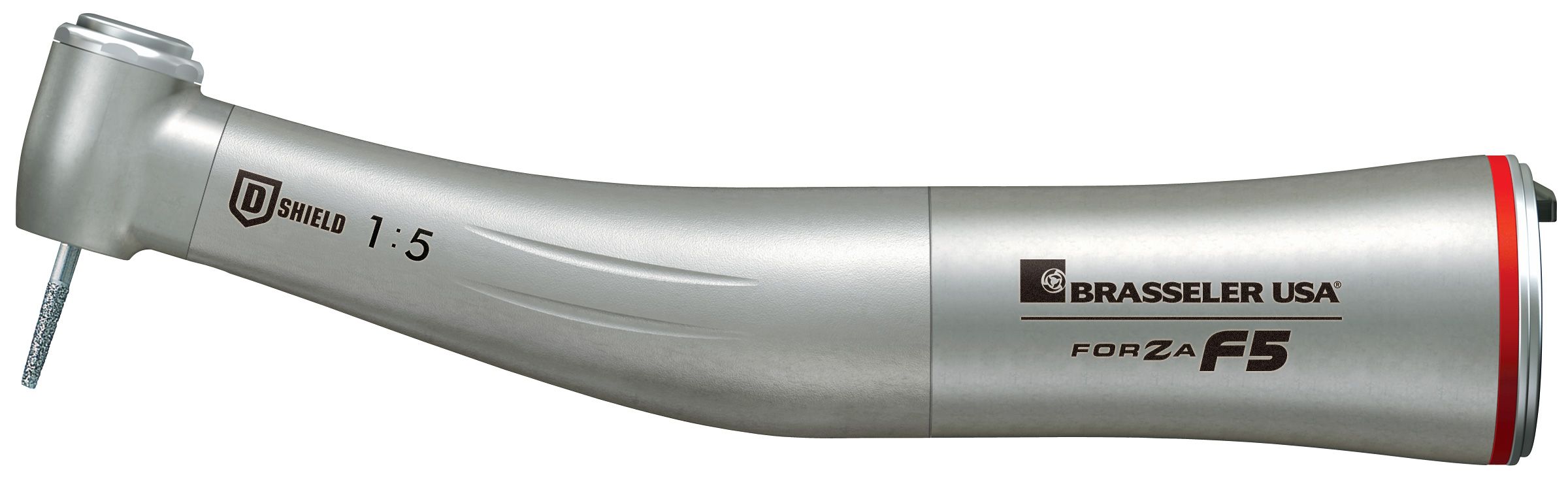 The Forza F5 handpeice is a 1:5 speed increasing electrical attachment. It is lightweight and comes in a solid titanium body. With this handpiece, practitioners can achieves speeds of 200,000 rpm when placed on most electrical dental motors. It features ceramic ball bearing, a four-port water spray and fiber optic abilities.