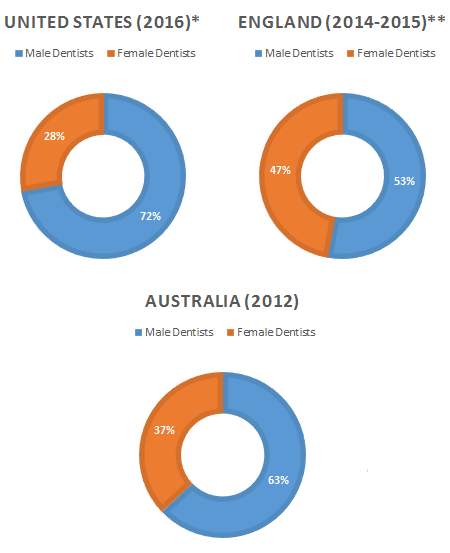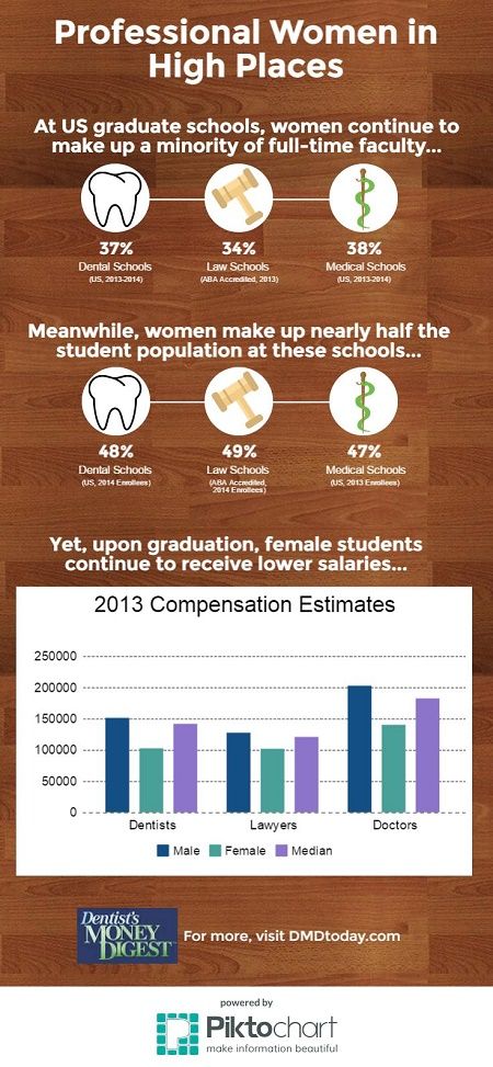 It’s not clear whether the significant percent of women dentists in the U.S. who work less than full-time accounts for the gap between their annual earning and those of male dentists, which is similar to the differences in income for female lawyers and physicians and their male counterparts, according to 2013 US Census figures.