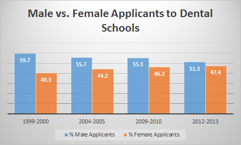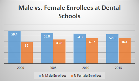 Dental school classes with an increasing proportion of female students will accelerate the trend toward a growing percentage of female dentists (see charts below), according to the Journal of Dental Education. The same article reported that in 2013 there were 22 dental schools where the majority of new first-year students were women, two that had a 50-50 split. One unnamed school had an entering class where 72.5% of the new students were women in the 2012-2013 academic year.
