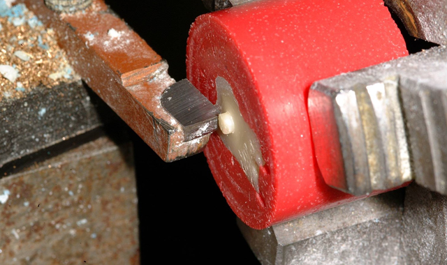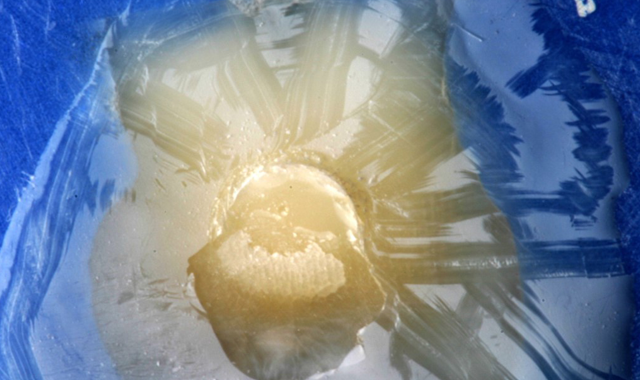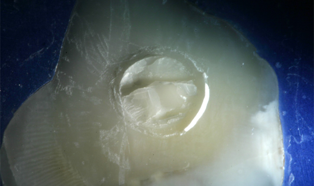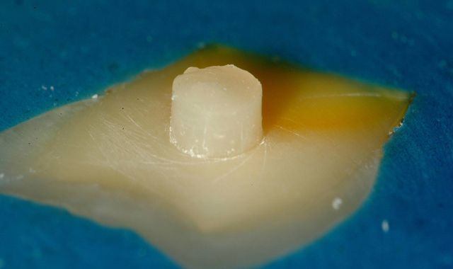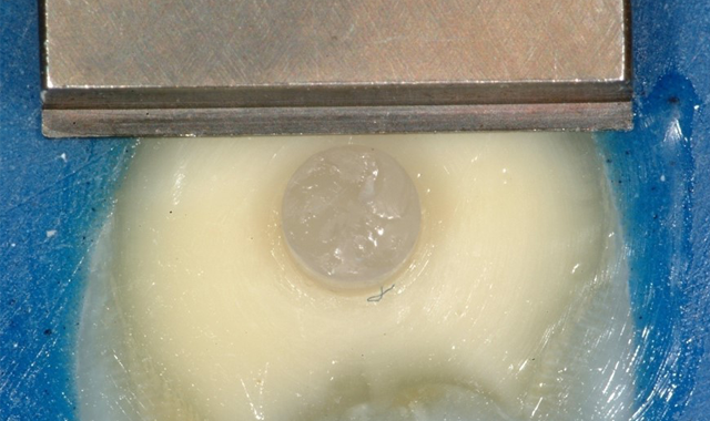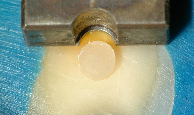 In a method used in a 1999 IADR research project, whole human teeth were embedded in PPMA cylinders and then cut on a lathe to produce a 2.38 mm diameter button of dentin protruding out from the buccal surface (Fig. 1). Buttons were produced in shallow, middle and deep dentin.
